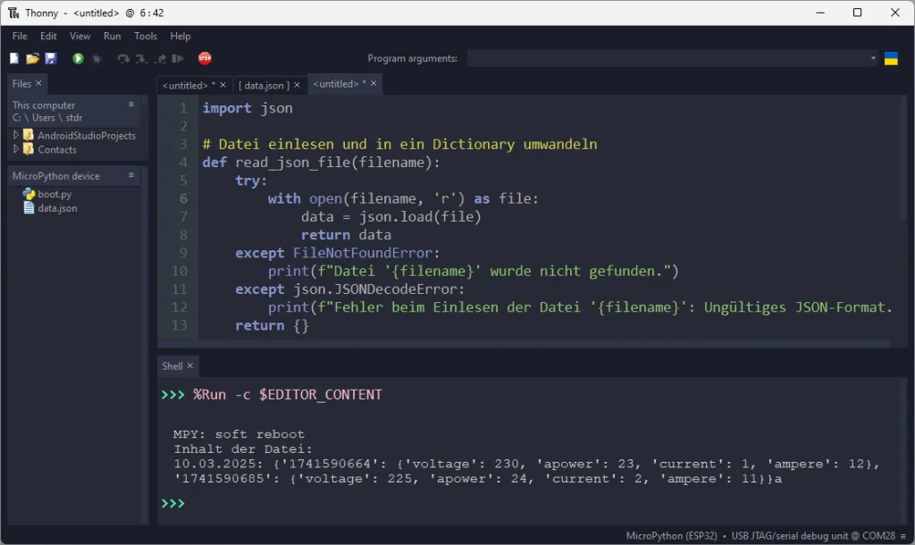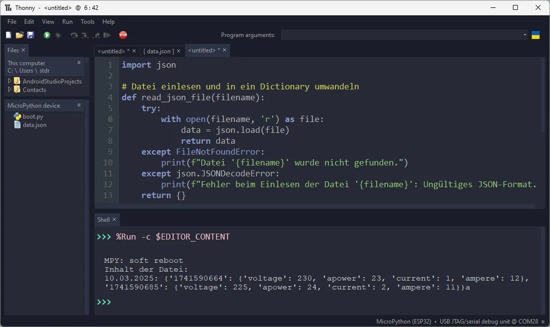 Dieser Code liest die Datei data.json, die sich auf dem Mikrocontroller befindet, ein und gibt deren Inhalt in der Shell von Thonny aus.