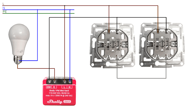- Der SW-Eingang des Shelly ist mit dem Ausgang des linken Wechselschalters verbunden.