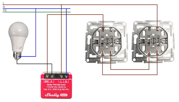 Der Ausgang des linken Wechselschalters ist mit dem SW-Eingang des Shelly verbunden.