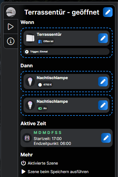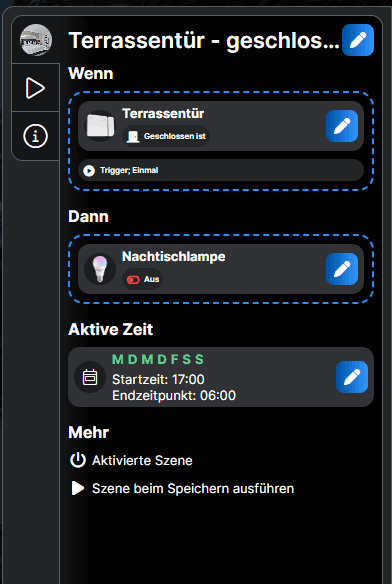 Die beiden Szenen zum aktivieren & deaktivieren der Lampe über ein Event des Shelly BLU Door/Window sind recht simple.
