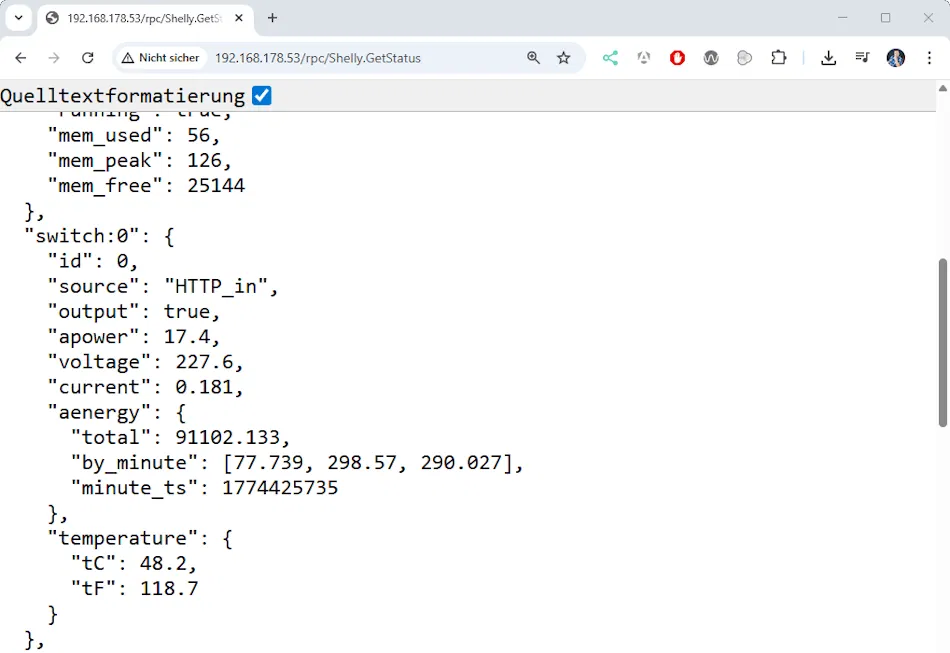 Über einen RPC-Call zum Shelly Plus 1PM kann man die aktuellen Daten vom angeschlossenen Verbraucher abrufen.