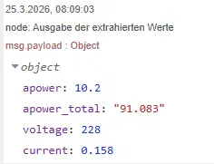 Mit der Function-Node extrahieren wir die Daten aus dem JSON. Da uns wie erwähnt nur die Werte von apower, voltage, current und aenergy.total interessieren fassen wir diese in ein JSON zusammen.