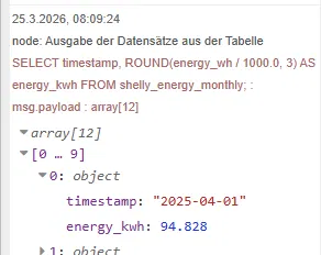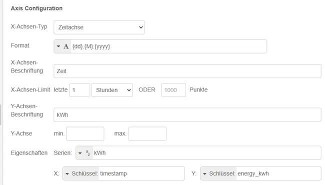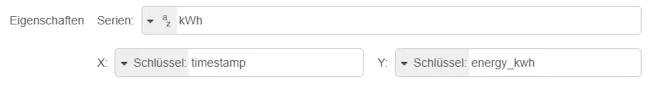 💡 Tipp: Falls im Diagramm keine Werte angezeigt werden, überprüfe mit einer Debug-Node, ob die Keys (timestamp, energy_kwh) korrekt gesetzt sind und die Daten im richtigen Format vorliegen.