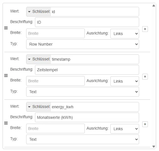 Im unteren Bereich müssen wir nun die Spalten definieren, Standardmäßig würden sonst die Spaltenüberschriften aus der Datenbank übernommen.