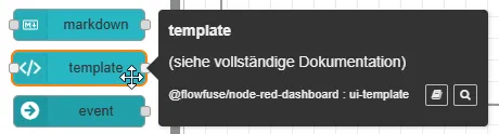Die Daten möchte ich nicht einfach nur als Text anzeigen sondern grafisch in einer Kachel (deutlich ansehnlicher). Hier verwende ich die Node template in welche HTML, CSS und auch JavaScript ausführen/anzeigen kann.