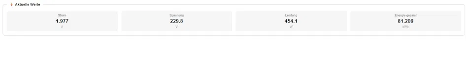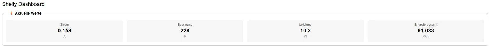 Im oberen Bereich des Dashboards zeigen wir außerdem die aktuellen Messwerte deines Shelly Plus 1PM an – darunter Strom, Spannung, Leistung und die insgesamt gemessene Energie. Diese Daten holen wir uns live vom Gerät, sodass dein Dashboard immer auf dem neuesten Stand ist.