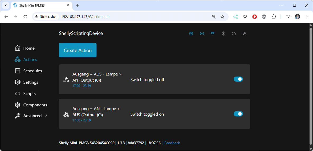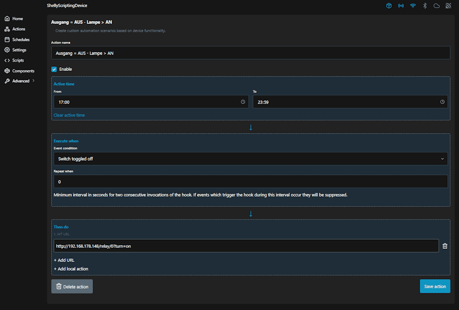 Das bedeutet jedoch nicht, dass lokale Automationen nicht möglich sind – im Gegenteil. Shelly bietet mit sogenannten Actions eine leistungsfähige Alternative. Actions werden direkt auf dem Gerät gespeichert und lokal ausgeführt. Über sie lassen sich HTTP-Requests an andere Shelly-Geräte senden, die über die lokale API angesprochen werden.