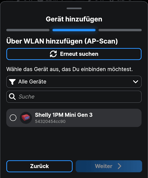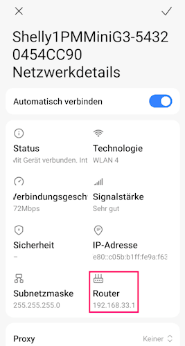 Nach dem Neustart ist das Gerät im Heimnetz erreichbar – ganz ohne Cloud. Und wir können dieses Gerät in der App Shelly Smart Control einrichten.