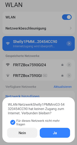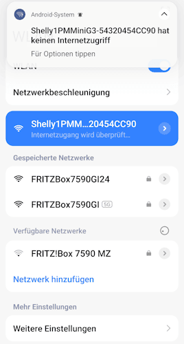 Wenn man sich mit dem Handy verbindet, erscheint ein Hinweis das dieses Netzwerk kein zugang zum Internet hat. Dieses muss man bestätigen damit sich das Gerät mit dem offenen AP vom Shelly verbindet!