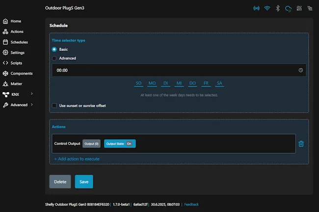 Mit der Basic-Zeitsteuerung erstellst du in wenigen Schritten eine einfache, wiederkehrende Schaltung. Hier zeige ich dir, wie du den Shelly Outdoor Plug S so einstellst, dass er jeden zweiten Tag um 9:00 Uhr eingeschaltet wird – und sich automatisch nach einer Stunde wieder abschaltet.