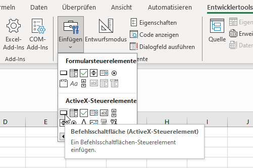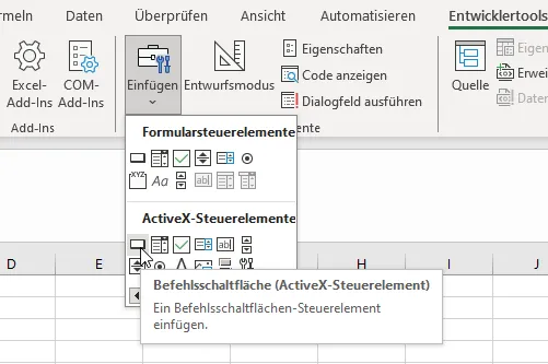 In dem neuen Reiter Entwicklertools können wir dann aus dem Bereich „ActivX Steuerelemente“ die Befehlsschaltfläche wählen und platzieren.