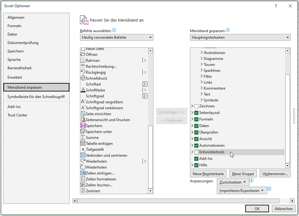 Wählen hier den Eintrag „Menüband anpassen“ aus und setzen dann auf der rechten Seite den Haken bei „Entwicklertools“.