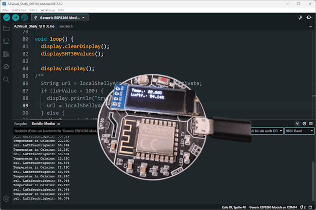 Wie du den AZ-Visual programmierst, habe ich dir bereits im Beitrag AZ-Visual im Test: Der kompakte Mikrocontroller mit OLED und Sensoren erläutert, dort habe ich dir ebenso gezeigt wie der SHT30 Sensor ausgelesen wird. Diesen Sensor bzw. die Sensorwerte wollen wir jetzt nutzen um den Shelly via HTTP-Request zu aktivieren bzw. zu deaktivieren.