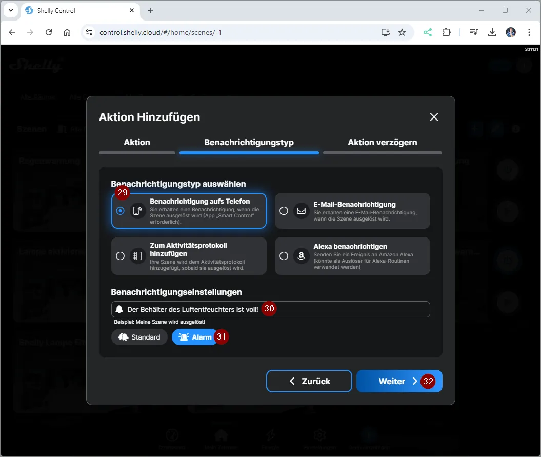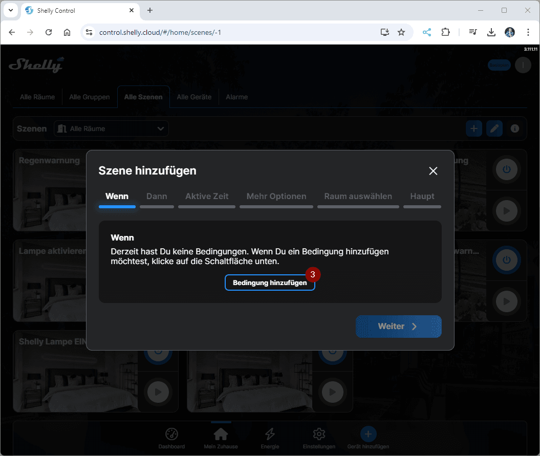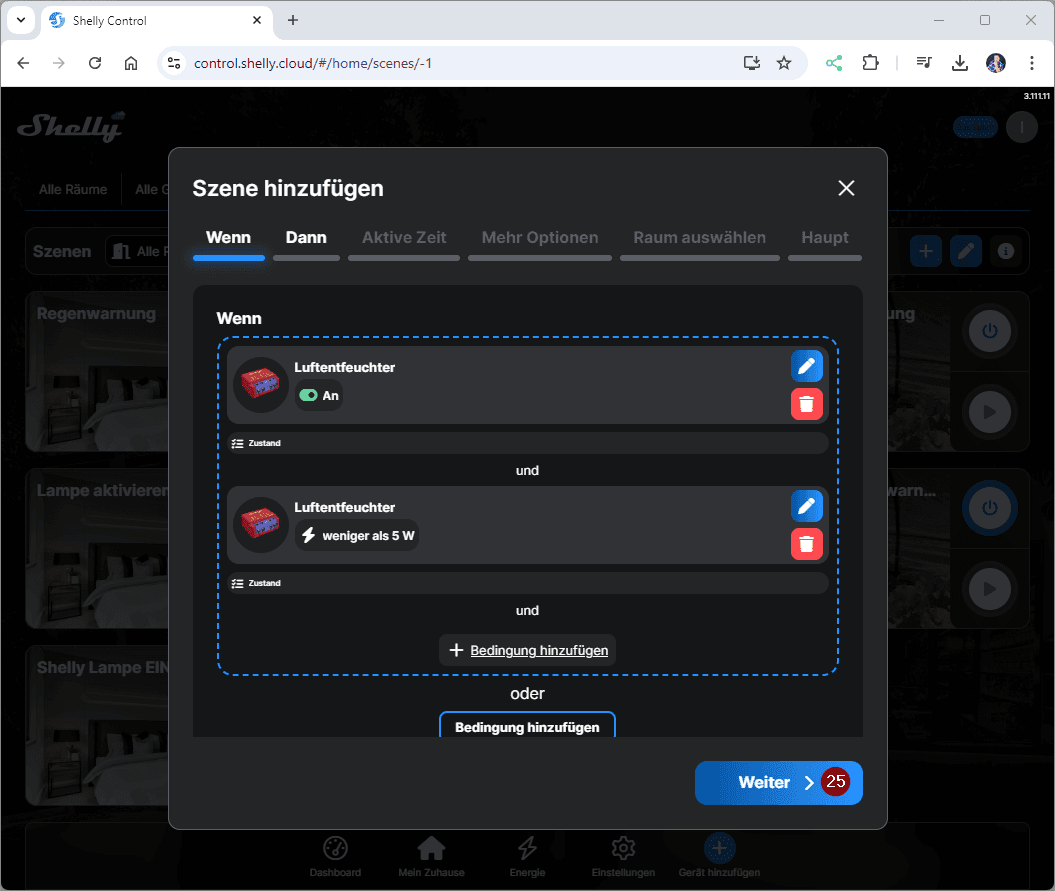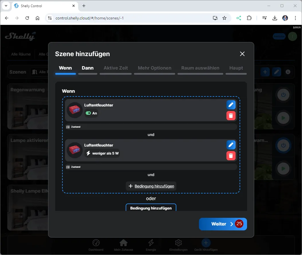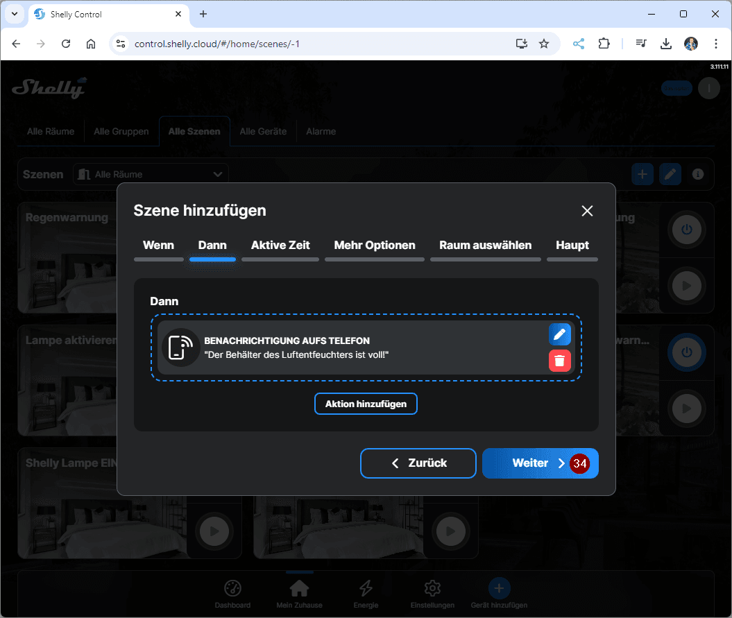 Erstellen wir jetzt erstmal die Szene in der ShellyCloud zum Benachrichtigen, wenn der Behälter des Luftentfeuchters voll ist. Du kannst diese Szene auch via Handy / Tablet erzeugen!