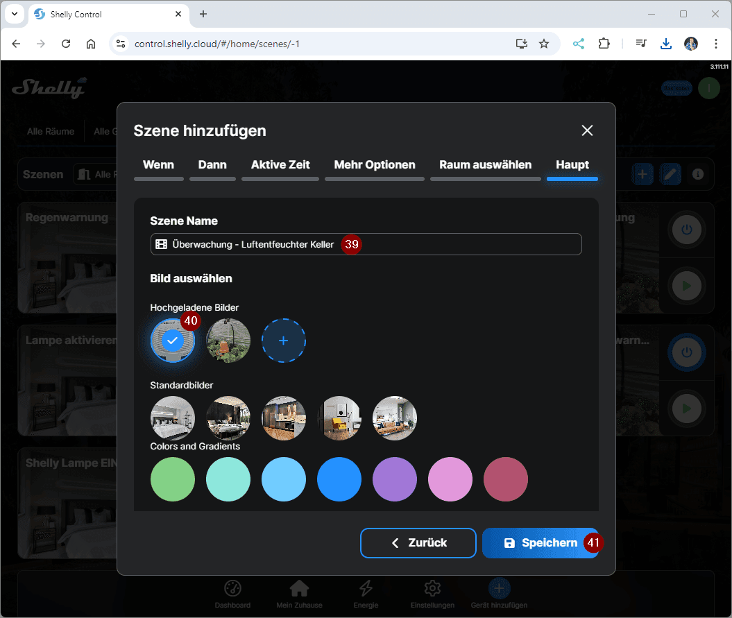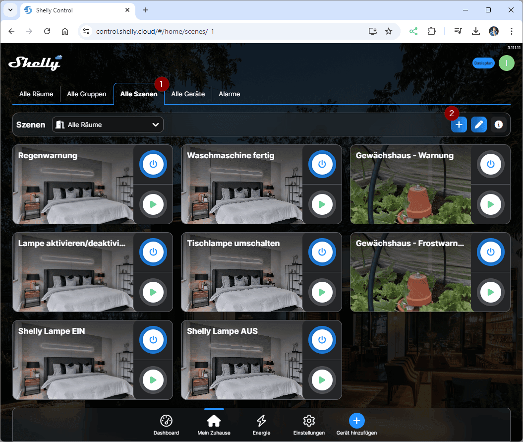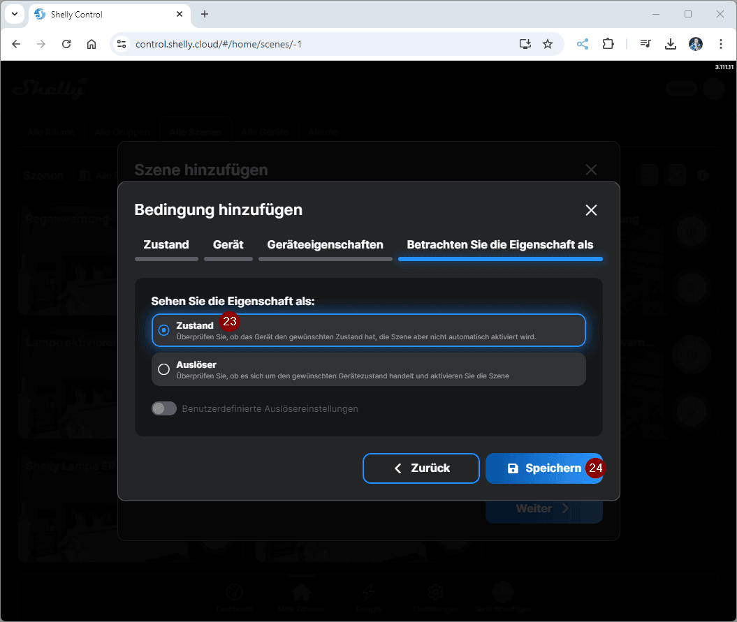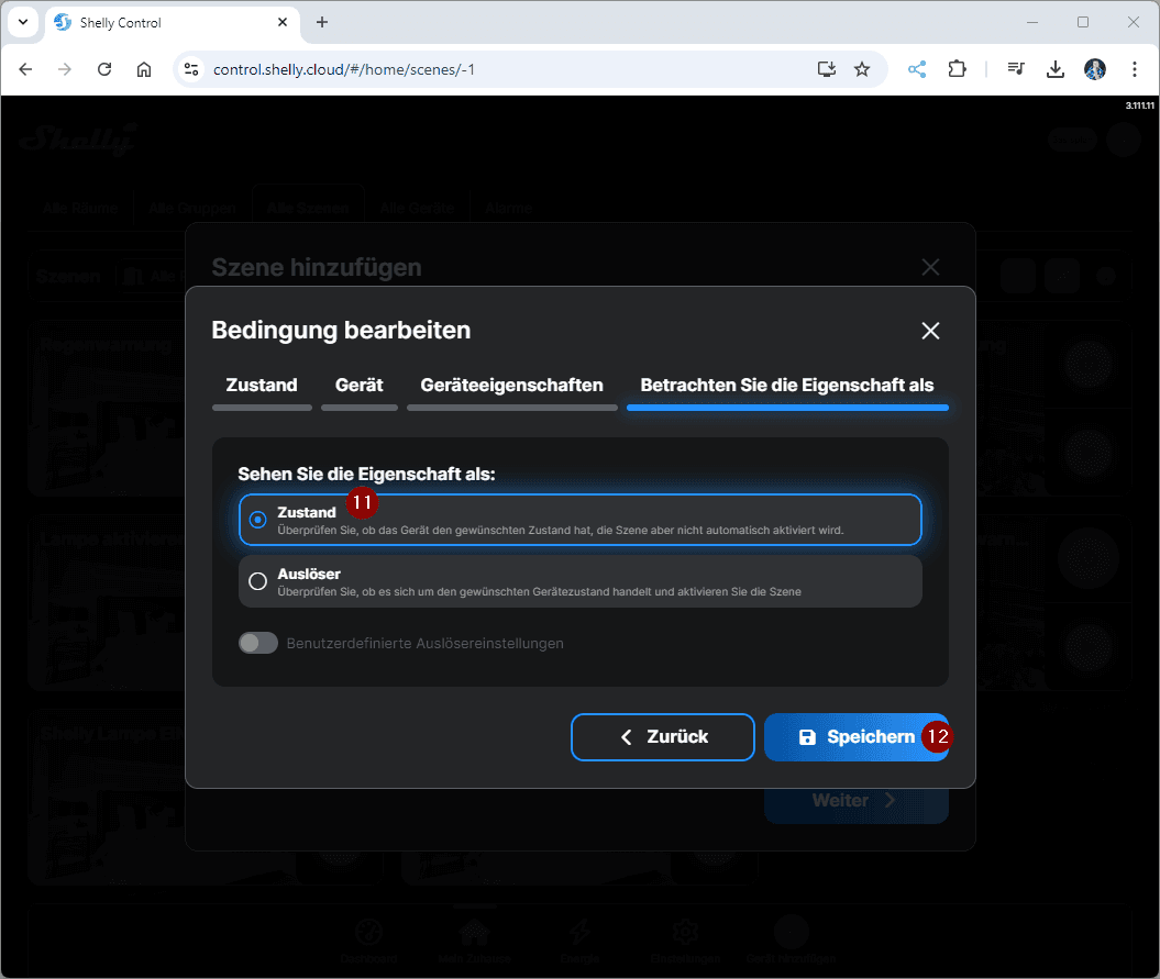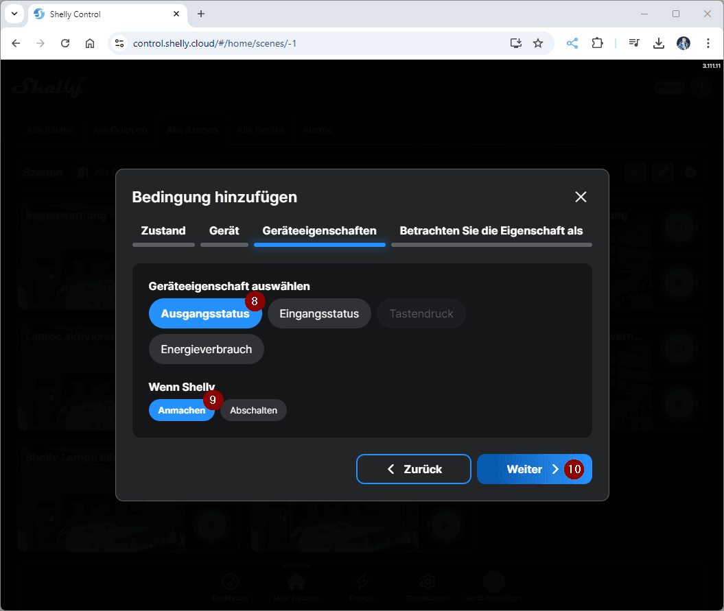Erstellen wir jetzt erstmal die Szene in der ShellyCloud zum Benachrichtigen, wenn der Behälter des Luftentfeuchters voll ist. Du kannst diese Szene auch via Handy / Tablet erzeugen!