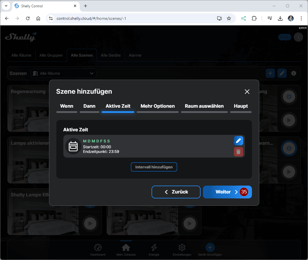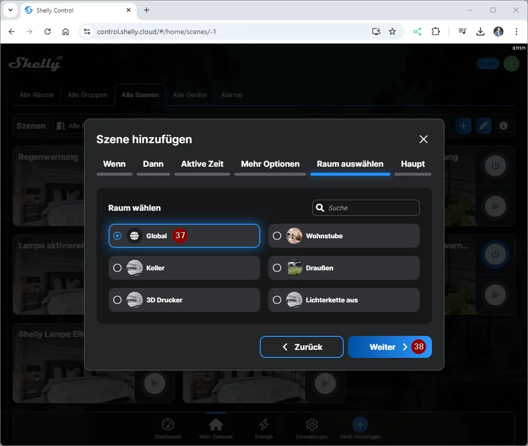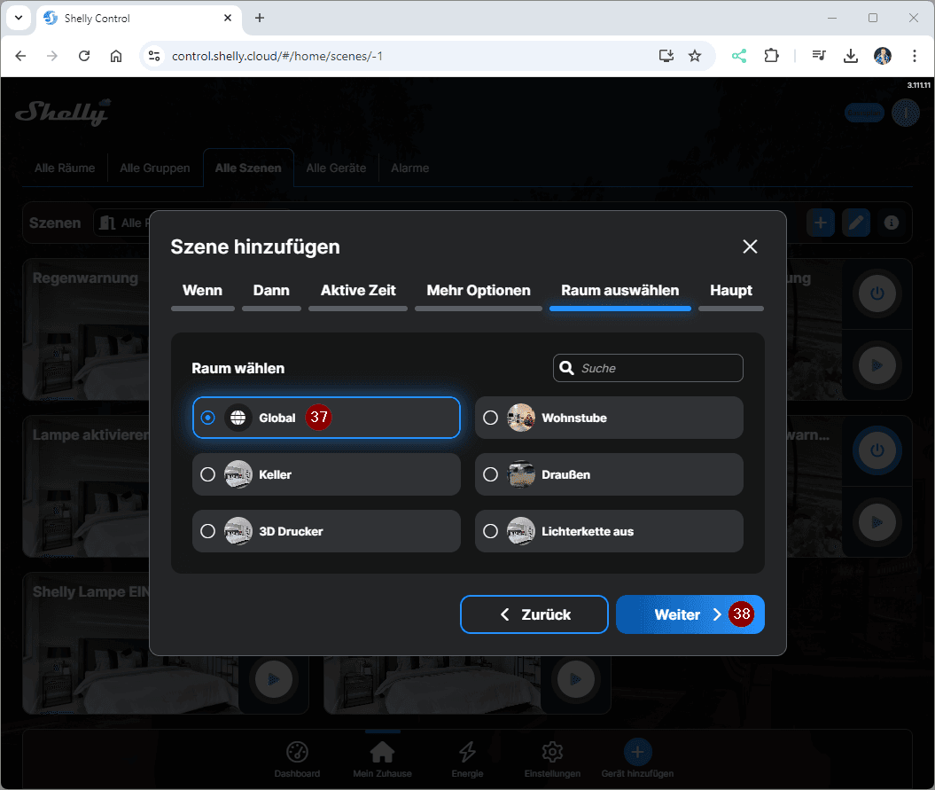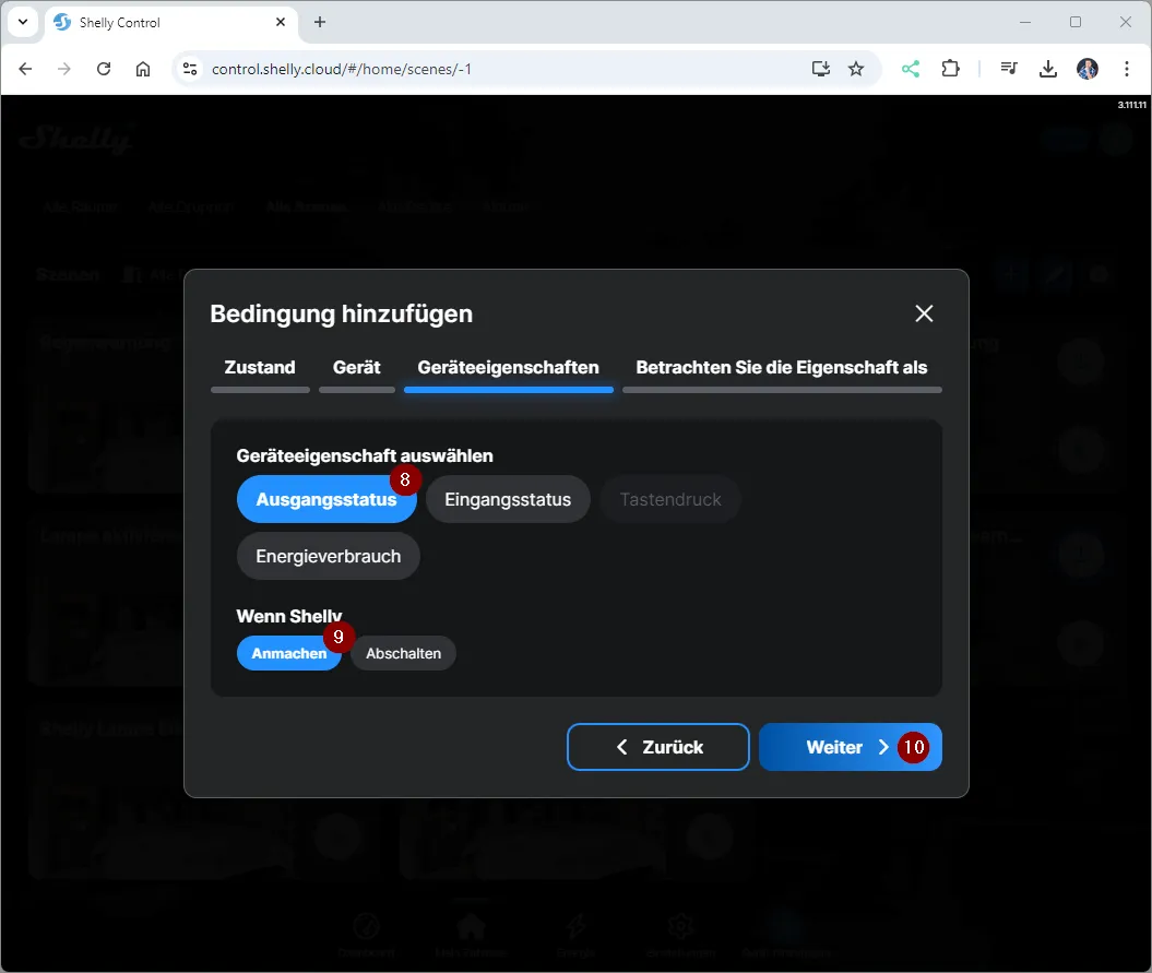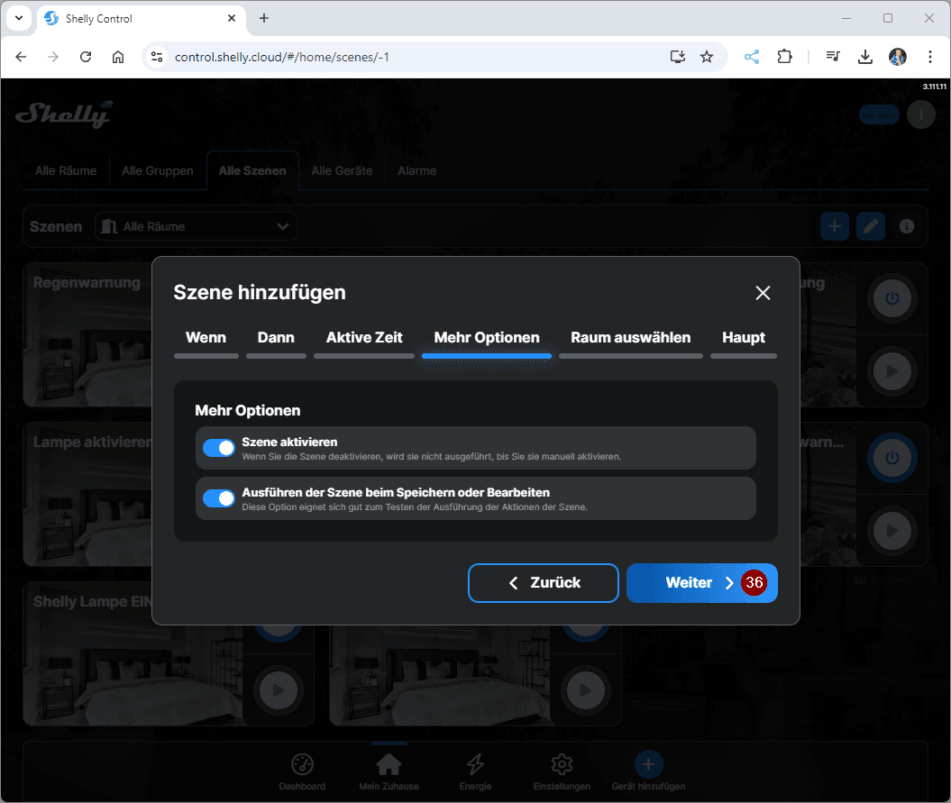 Erstellen wir jetzt erstmal die Szene in der ShellyCloud zum Benachrichtigen, wenn der Behälter des Luftentfeuchters voll ist. Du kannst diese Szene auch via Handy / Tablet erzeugen!