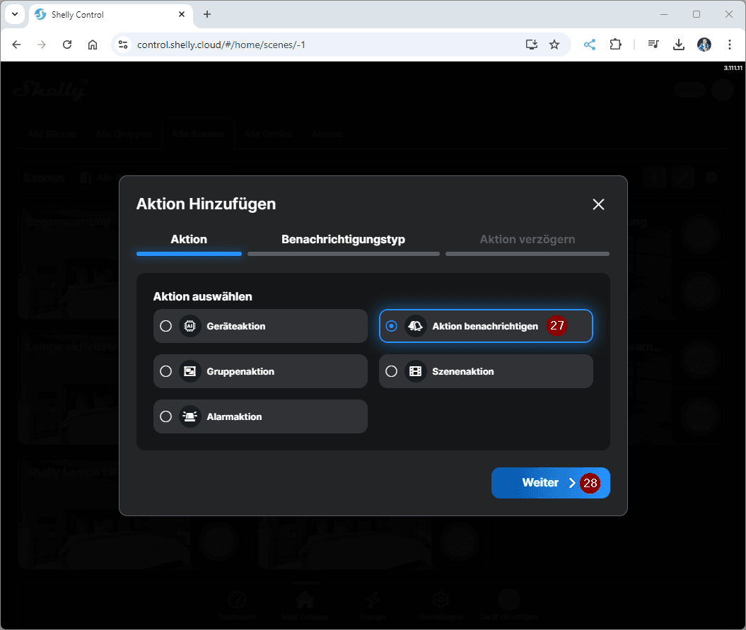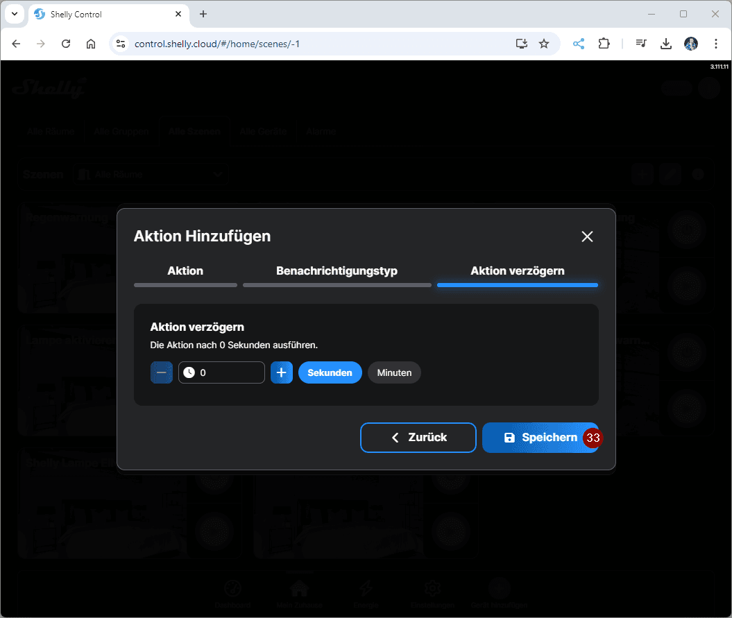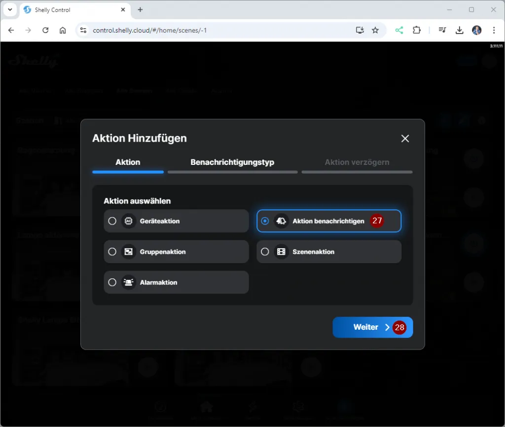 Hier können wir diverse Aktionen konfigurieren. In meinem Fall möchte ich gerne eine Benachrichtigung an mein Handy senden lassen. Für diese Aktion wird jedoch die App Shelly Smart Controll auf dem Gerät benötigt!