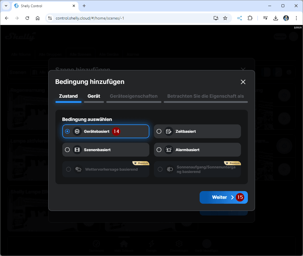 Da wir ein Gerät steuern möchten, welches mit einem Shelly verbunden ist, ist diese Bedingung „Gerätebasiert“, dieses wählen wir und klicken auf die Schaltfläche „Weiter“.