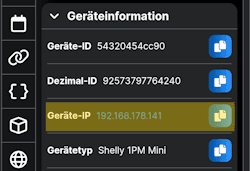 Vom Shelly benötigen wir die IP-Adresse, diese können wir aus der Ansicht „Einstellungen“ unter „Geräte-IP“ ablesen.