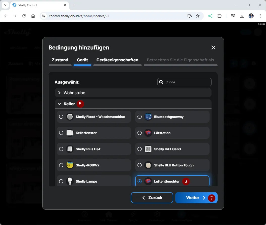 Im nächsten Schritt wählen wir den Shelly aus, mein Gerät befindet sich im Raum „Keller“ und trägt bereits die Bezeichnung „Luftentfeuchter“.