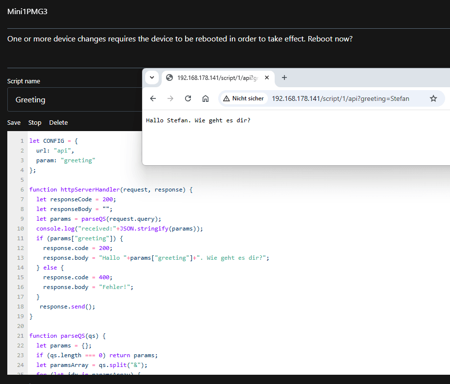 // Anfragen können z. B. mit http://<Shelly-IP>/api?greeting=Max gestellt werden.
