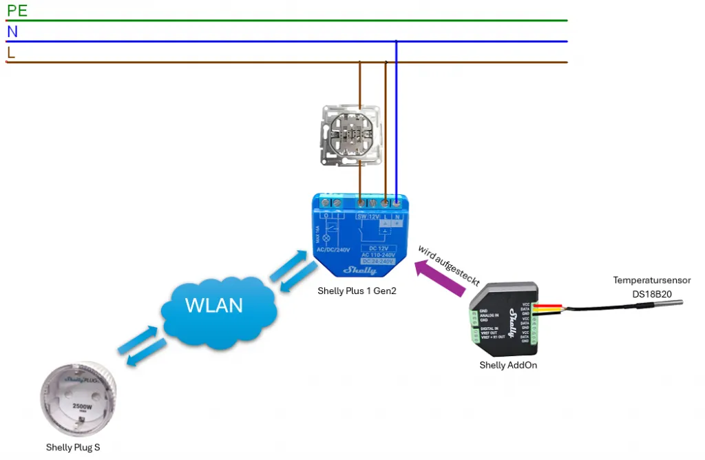 Schaltungsaufbau: Shelly Plug S & Shelly Plus 1 mit Temperatursensor