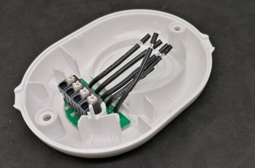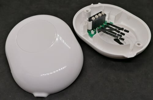 Der Shelly Button besteht aus zwei Schalen, einer Tasteinheit und einer kleinen Platine, welche mit einem Taster sowie Klemmen und Leitungen für den Shelly 1 / Shelly 1 PM ausgestattet ist.