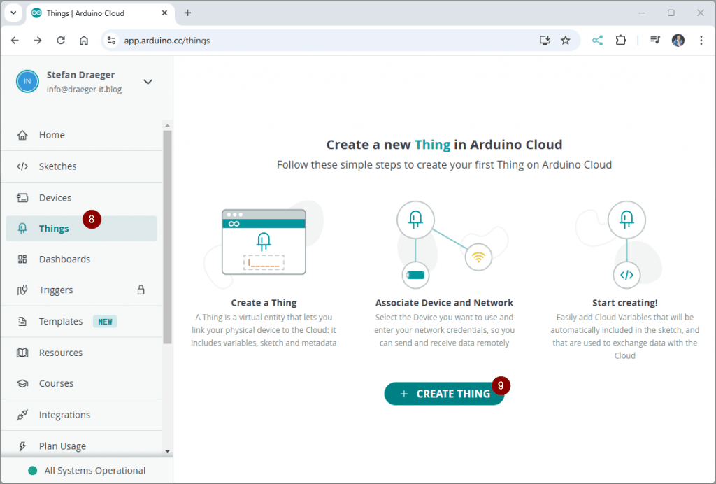 Zunächst klicken wir im Menü auf den Eintrag „Thing“ (8) und wählen anschließend die Schaltfläche „CREATE THING“ (9).