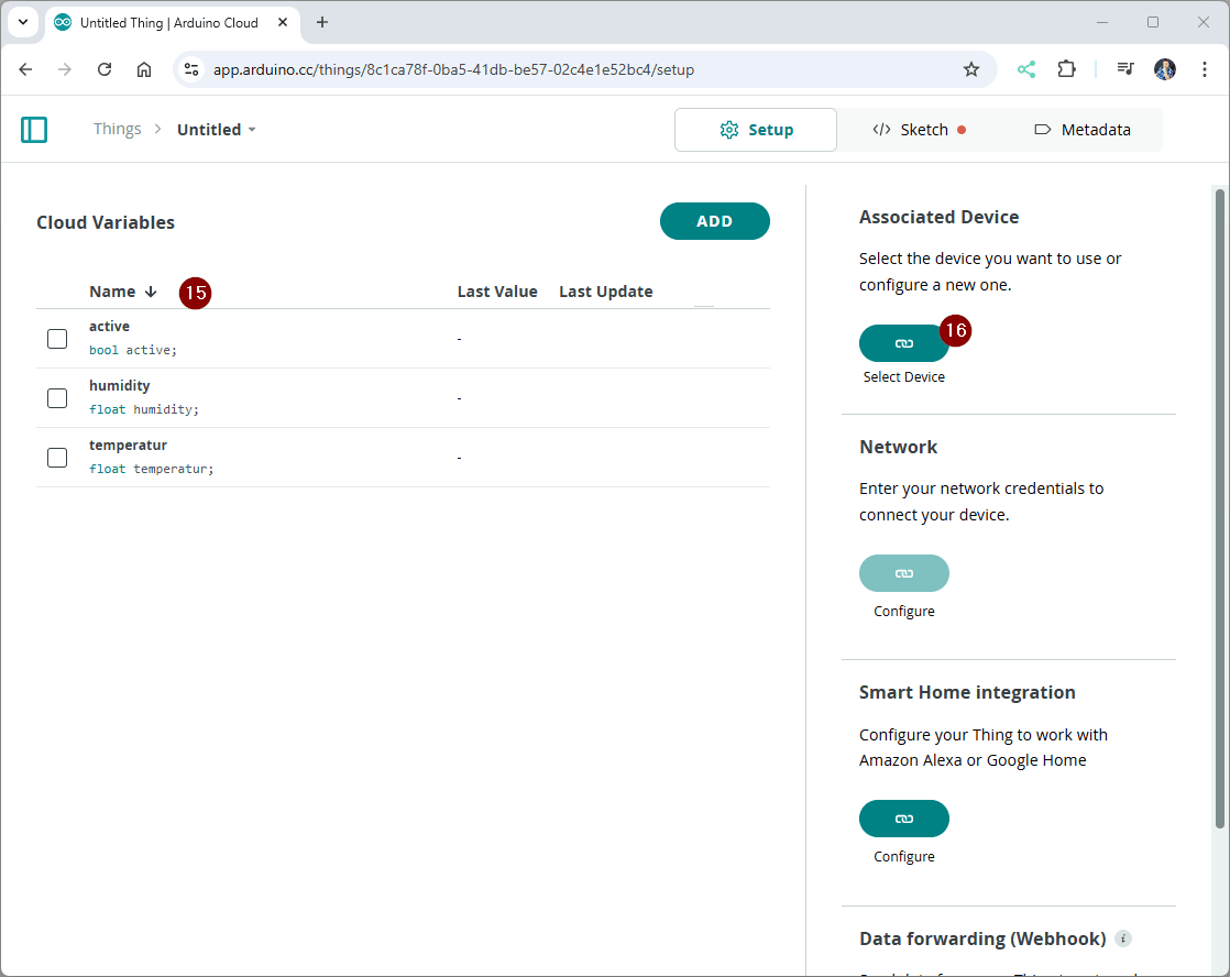 Nachdem die Variablen angelegt wurden (15), verknüpfen wir unseren Mikrocontroller mit dem Thing, dazu klicken wir auf der rechten Seite auf die Schaltfläche „Select Device“ (16).
