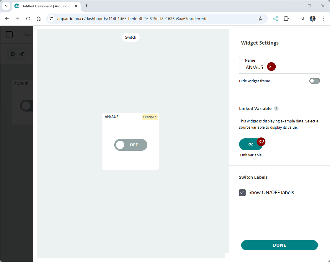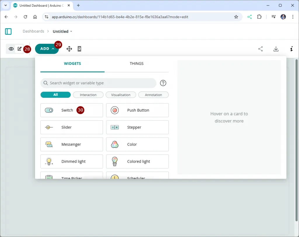 Klicken wir nun auf den Bleistift (28) und wählen anschließend die Schaltfläche „ADD“ (29). Aus dem Dropdown Menü können wir nun verschiedene Elemente für unser Dashboard auswählen. Starten wir zunächst mit dem Schalter (engl. Switch) (30).