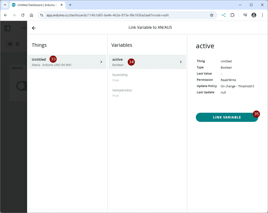 Da wir zur Zeit nur ein Thing konfiguriert haben (33), ist auch nur eines angezeigt aus welchem wir die Variable active (34) auswählen und dieses mit der Schaltfläche „LINK VARIABLE“ (35) bestätigen. Den Dialog verlassen wir anschließend über die Schaltfläche „DONE“.