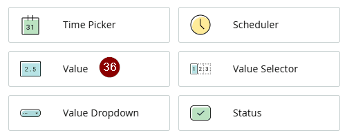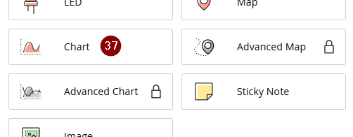 Dieses Vorgehen wiederholen wir nach bedarf für die Variablen temperatur und humidity. Wenn wir den Wert in einem Block anzeigen lassen wollen, dann wählen wir den Block „Value“ (36) und für das Diagramm „Chart“ (37).