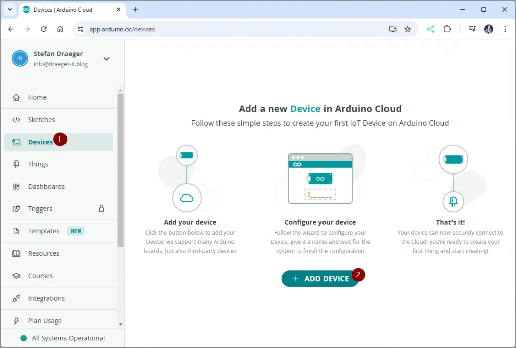 Wenn der Arduino Cloud Agent installiert wurde, dann müssen wir diesen einrichten, dazu öffnen wir in der Cloud den Menüpunkt „Devices“ (1) und wählen dort die Schaltfläche „ADD DEVICE“ (2)