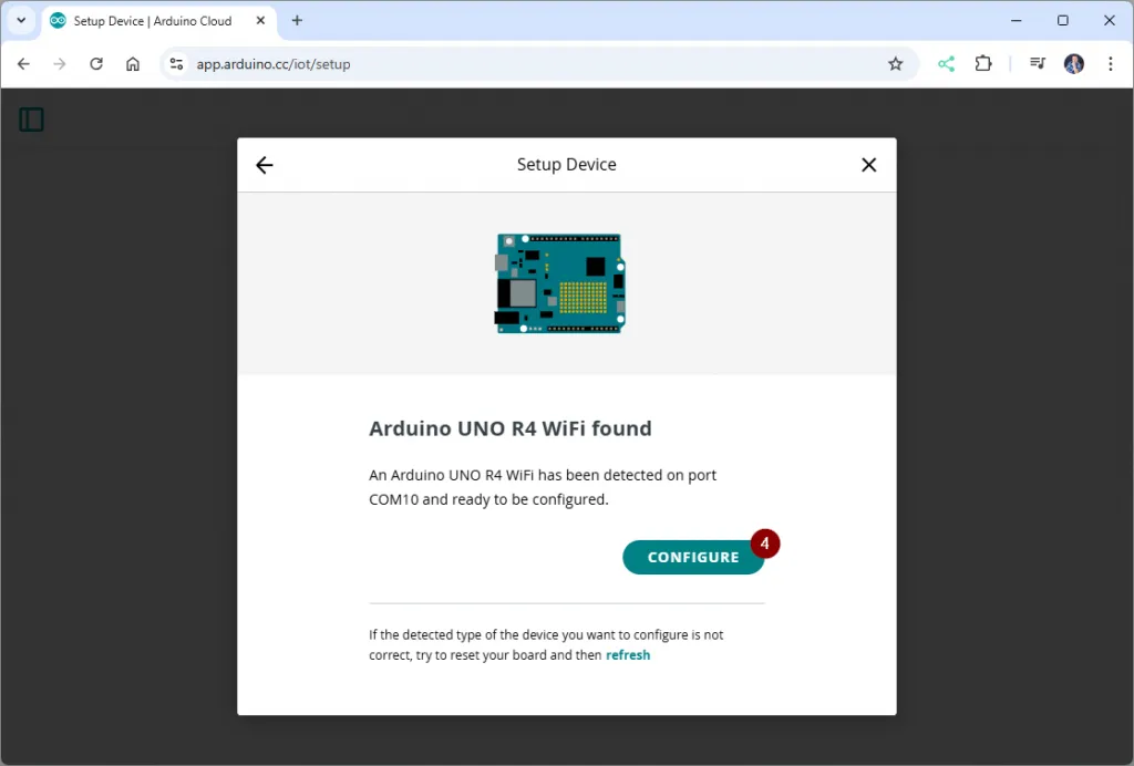 Im nächsten Schritt müssen wir zunächst auswählen welchen Typ wir verbinden wollen. Da wir den originalen Arduino UNO R4 WiFi haben, wählen wir hier die Kachel mit dem Arduino Logo (3).