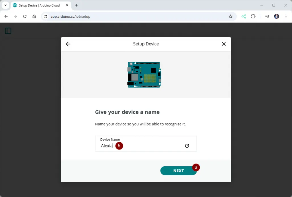 Dem Gerät müssen wir einen Namen (5) vergeben und diesen Schritt über die Schaltfläche „NEXT“ (6) verlassen.