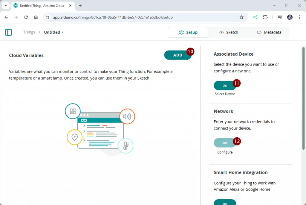 An diesem Thing kannst du nun Variablen hinzufügen (10), ein Gerät verknüpfen (11) und die WiFi Verbindung konfigurieren (12).