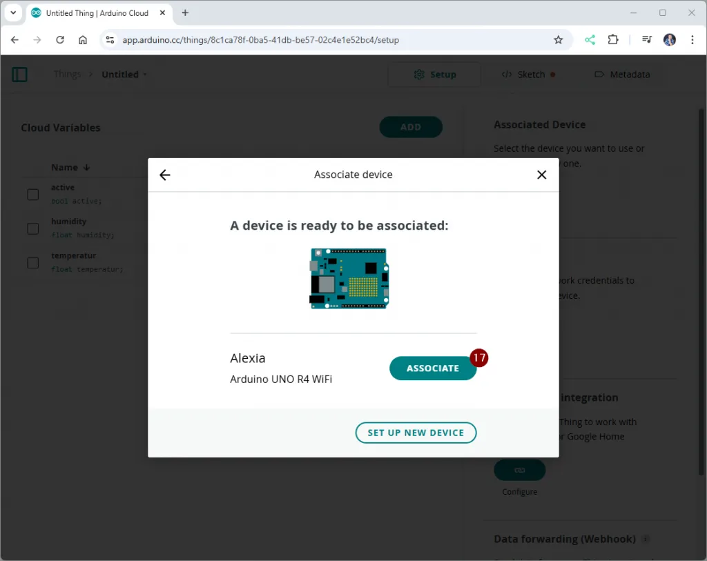 Im neuen Dialog werden alle konfigurierten Mikrocontroller aufgelistet. Da wir zu diesem Zeitpunkt nur einen Mikrocontroller eingerichtet haben, klicken wir hier am Eintrag für den Arduino UNO R4 WiFi die Schaltfläche „ASSOCIATE“ (17).