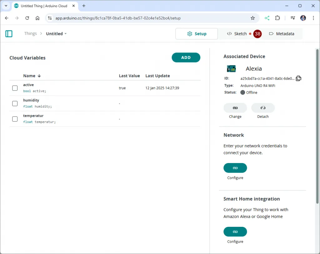 Wir können über die Arduino Cloud ein Sketch generieren lassen welches bereits das nötigste enthält. Dazu öffnen wir das zuvor konfigurierte Thing und wählen oben rechts den Link „</> Sketch“ (38). Anschließend klicken wir auf „GENERATE SKETCH“.