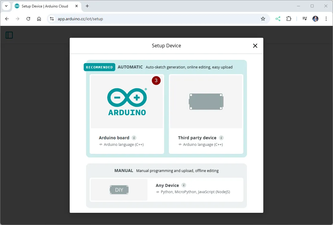 Im nächsten Schritt müssen wir zunächst auswählen welchen Typ wir verbinden wollen. Da wir den originalen Arduino UNO R4 WiFi haben, wählen wir hier die Kachel mit dem Arduino Logo (3).