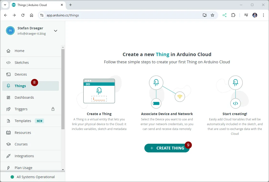 Zunächst klicken wir im Menü auf den Eintrag „Thing“ (8) und wählen anschließend die Schaltfläche „CREATE THING“ (9).