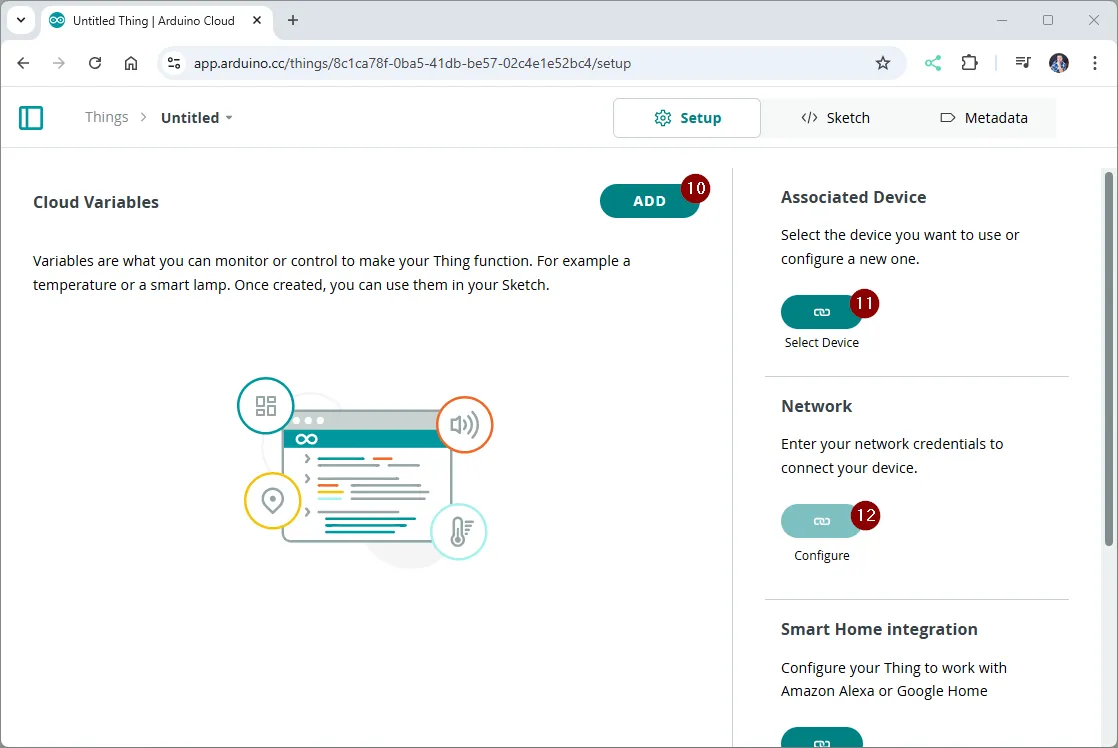 An diesem Thing kannst du nun Variablen hinzufügen (10), ein Gerät verknüpfen (11) und die WiFi Verbindung konfigurieren (12).