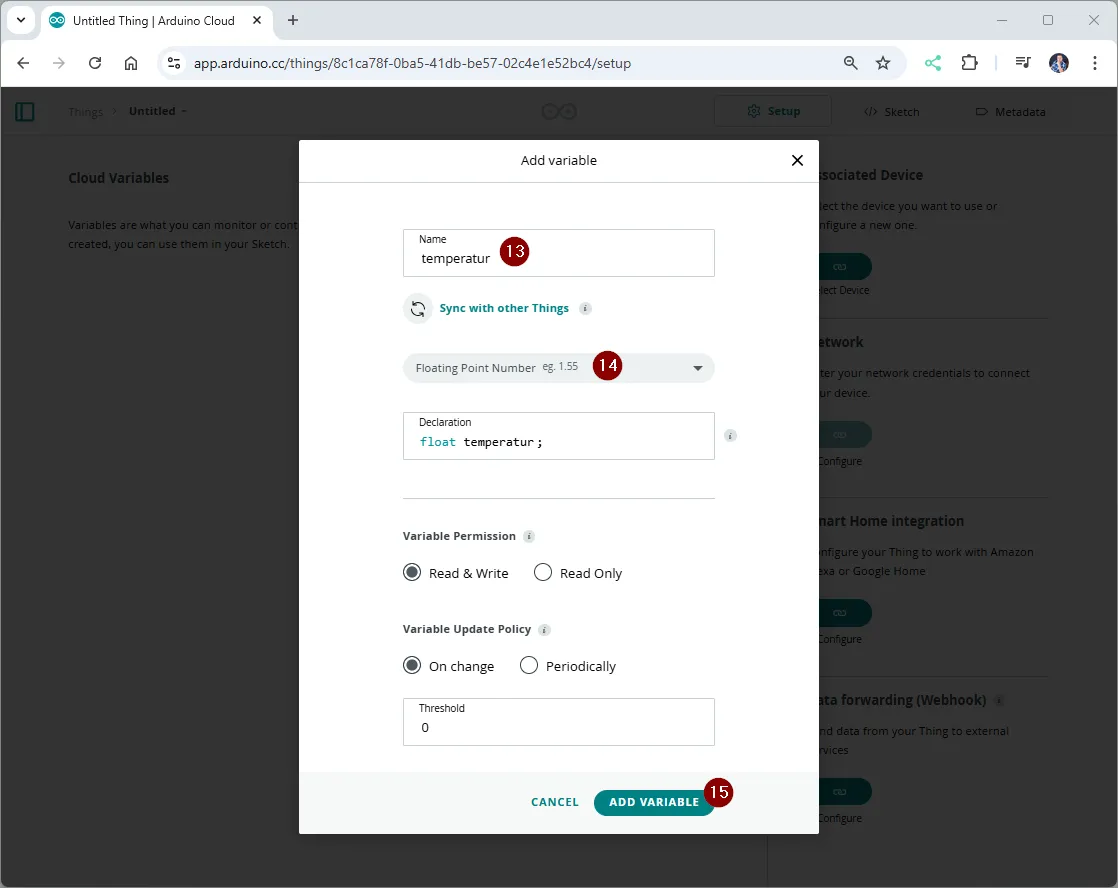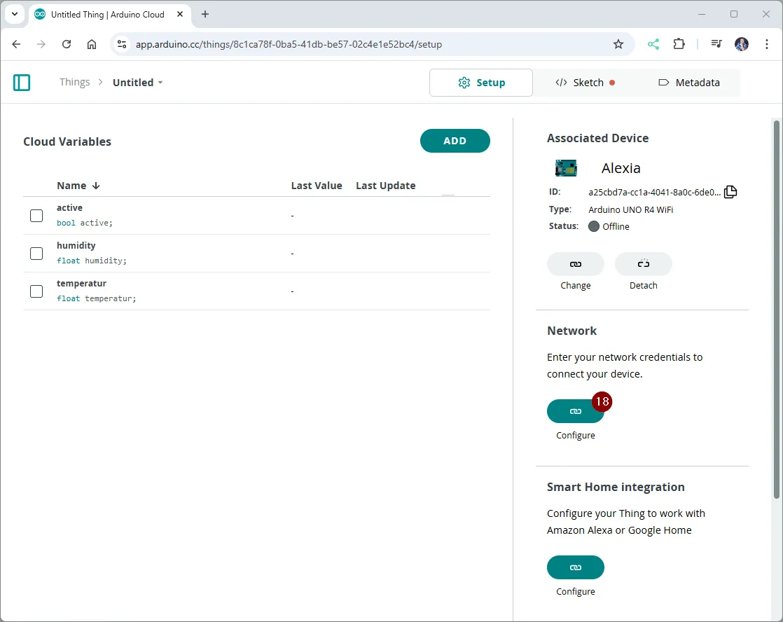 Ein Thing in der Arduino Cloud ist eine Collection aus Variablen und Konfigurationen welche du später in deinem Dashboard & Sketch verwenden kannst. Daher müssen wir diesen nach dem aufbau der Verbindung zum Mikrocontroller erstellen. Du kannst an deinem konfigurierten Thing jederzeit Variablen hinzufügen und ändern!