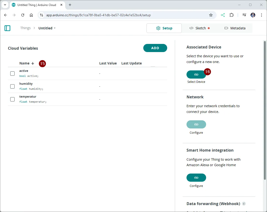 Nachdem die Variablen angelegt wurden (15), verknüpfen wir unseren Mikrocontroller mit dem Thing, dazu klicken wir auf der rechten Seite auf die Schaltfläche „Select Device“ (16).