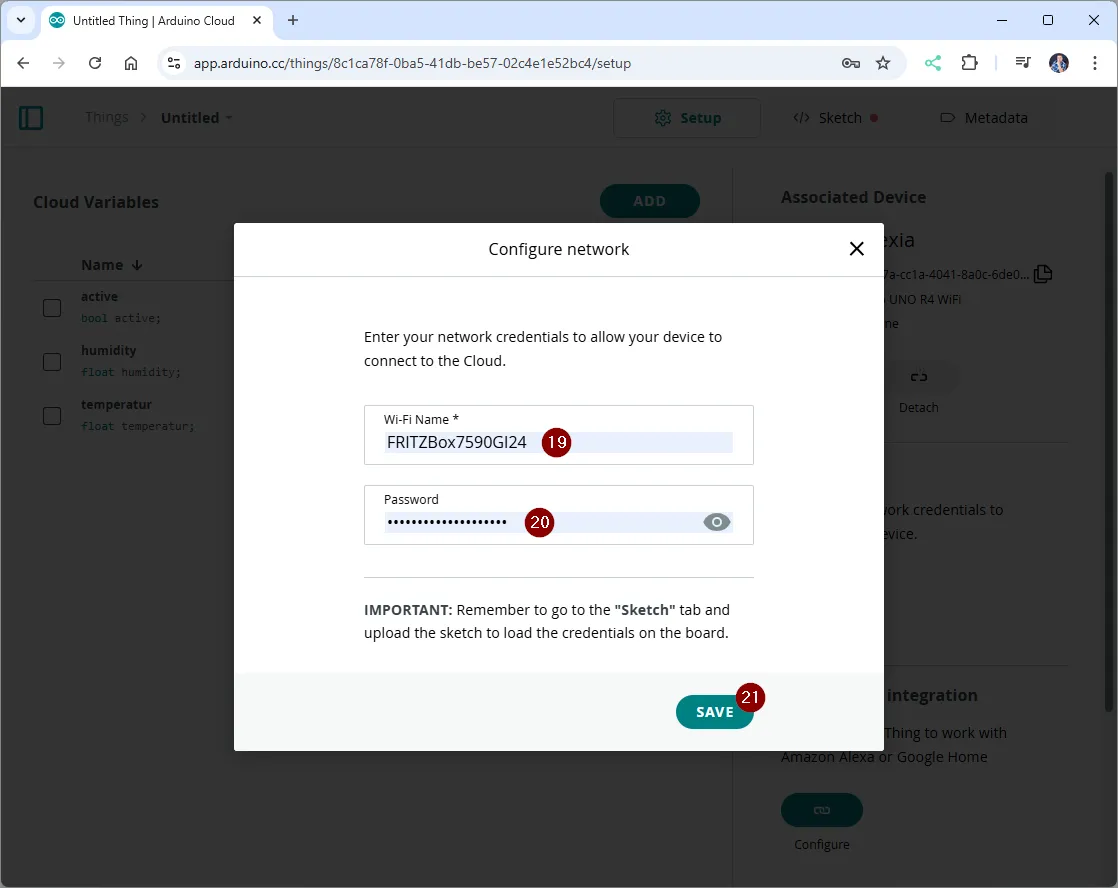 Im neuen Dialog gibst du nun deine SSID (19) und dein Passwort (20) ein. Diese Eingabe bestätigst du abschließend mit der Schaltfläche „SAVE“ (21).