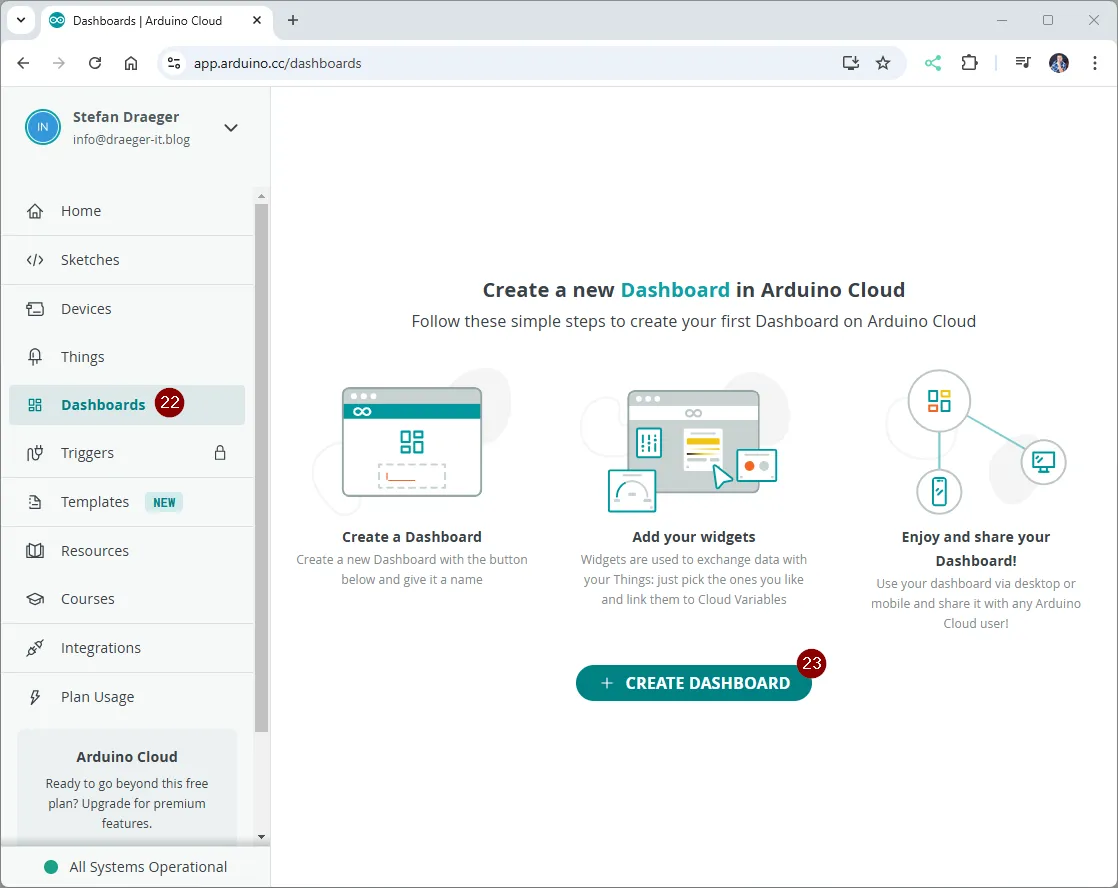 Nun können wir endlich unser Dashboard erstellen und die Sensordaten vom Arduino visualisieren. Dazu klicken wir im Menü auf „Dashboard“ (22) und wählen dort die Schaltfläche „CREATE DASHBOARD“ (23).