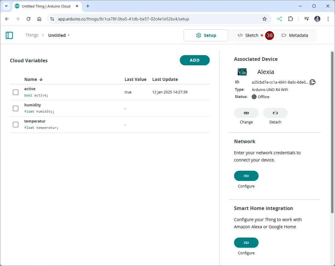 Wir können über die Arduino Cloud ein Sketch generieren lassen welches bereits das nötigste enthält. Dazu öffnen wir das zuvor konfigurierte Thing und wählen oben rechts den Link „</> Sketch“ (38). Anschließend klicken wir auf „GENERATE SKETCH“.