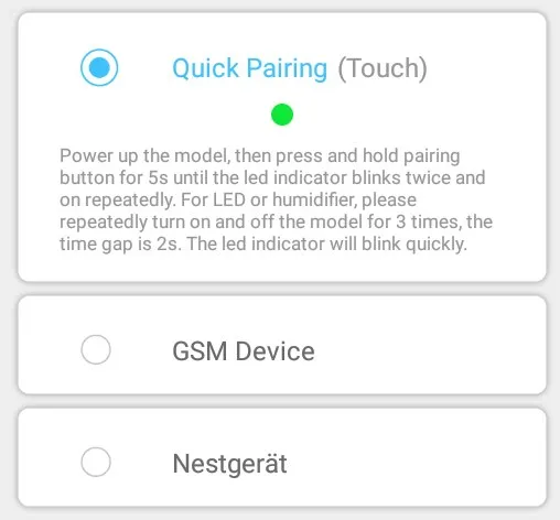 Es gibt hier 3 Modi wie man ein Gerät anbinden kann, dieses je nach Gerät unterschiedlich. Ich habe ein Wi-Fi Switch, somit verwende ich den ersten (aktiven) Eintrag.
