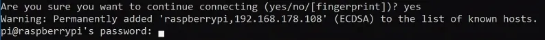 Wie erwähnt, wird bei der ersten Verbindung die SSH-Schlüssel wechselseitig ausgetauscht. Dieses müssen wir mit yes bestätigen.