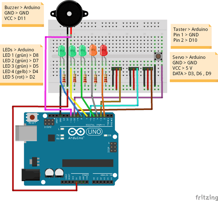 Die Schaltung am normalen Arduino UNO ist recht einfach, denn wir steuern lediglich 3 Servomotoren über jeweils 3 digitale Pins und die LEDs. Der Buzzer dient zusätzlich zur akustischen Untermalung, dass eine neue Runde gestartet ist.