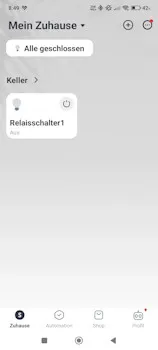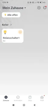 Du wirst direkt zur Startseite der App weitergeleitet, wo das neue Gerät als Kachel angezeigt wird. Über diese Kachel kannst du das Relais ab sofort ein- und ausschalten und später auch in Szenen und Automationen einbinden.
